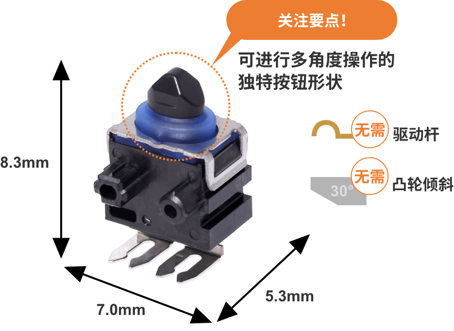實(shí)現(xiàn)(1)和(2)最簡(jiǎn)單的方法就是從正上方按壓,也就是從行程(完全按下開關(guān)的距離)最短的角度按壓。但要設(shè)計(jì)行程只有幾毫米的超微小型開關(guān)的垂直按壓并不容易。