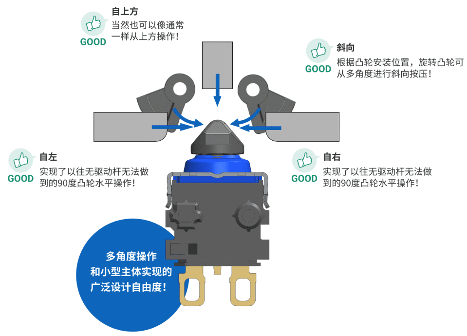 D2EW開關(guān)通過(guò)歐姆龍全新研發(fā)的獨(dú)特按鈕形狀,無(wú)需驅(qū)動(dòng)桿、無(wú)需傾斜水平凸輪即可從水平方向進(jìn)行操作。除了水平方向,還可從其他角度進(jìn)行操作。(參照下圖)