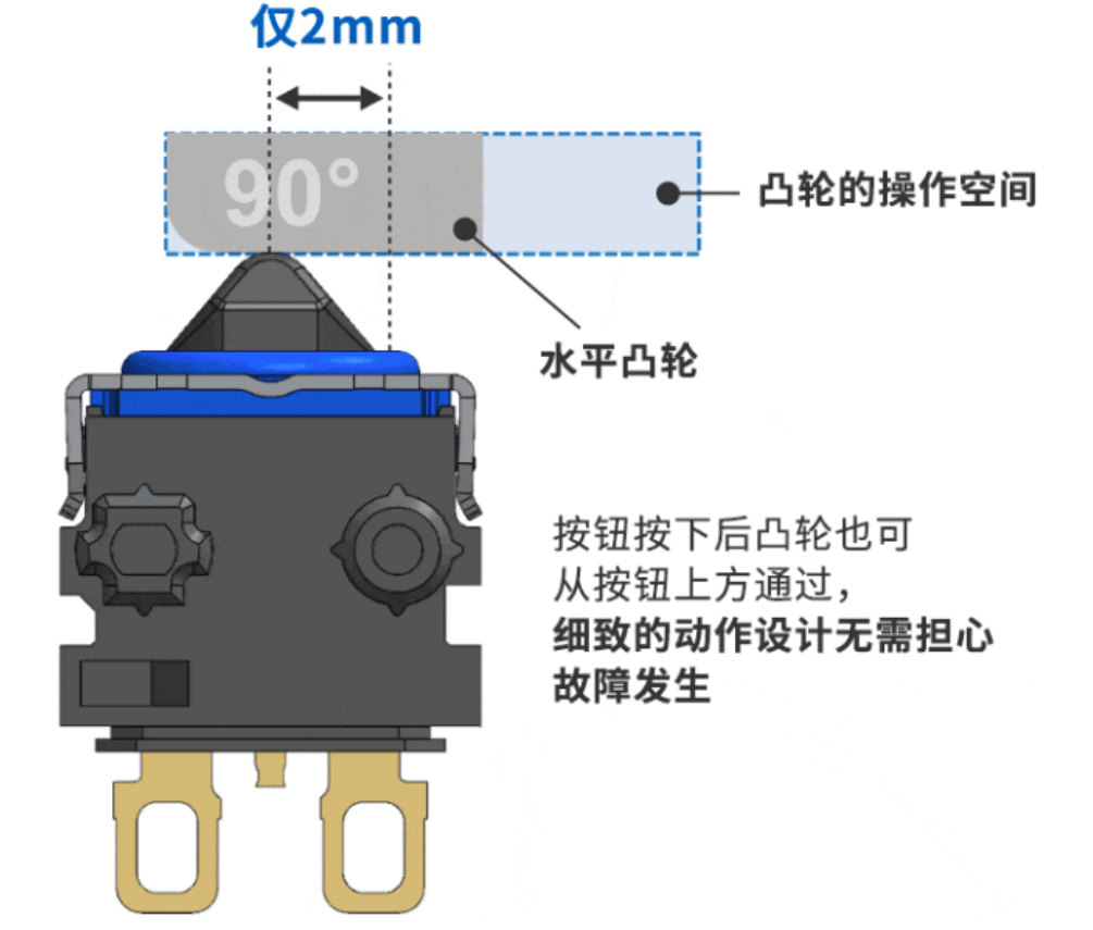 由于無(wú)驅(qū)動(dòng)桿,水平凸輪只需最小的移動(dòng)即可完全按下按鈕,因此有助于節(jié)省空間。