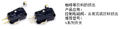 (4)產品推廣四:咖啡等飲料的擠出,推薦使用歐姆龍大容量V系列微動開關,用于控制電磁閥,實現飲料擠出的功能: