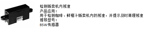 5)產品推廣五:檢測販賣機內殘渣,推薦使用歐姆龍B5W傳感器,用于檢測咖啡、鮮橙汁販賣機內的殘渣,并提示及時清理殘渣: