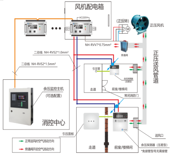 2, 余壓監(jiān)控系統(tǒng)通過余壓探測器實時監(jiān)測余壓值(前室/走道或樓梯間/走道氣壓差值), 當余壓值超過報警設(shè)定值(前室30Pa, 樓梯間50Pa),余壓探測器將發(fā)出報警信號,同時聯(lián)動余壓控制器控制旁通閥開啟,減少正壓風機前室或樓梯間的送風量,降低前室或樓梯間余壓值。