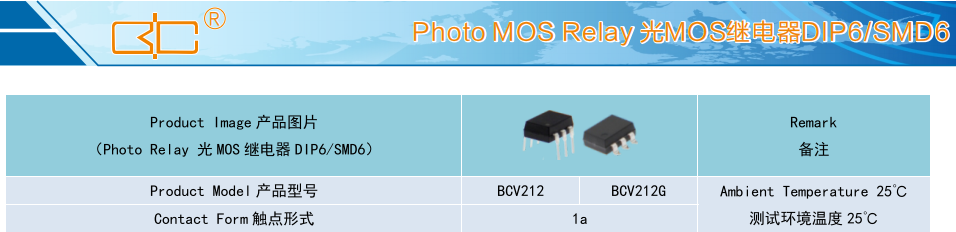 (Relay 光 MOS 繼電器 DIP6/SMD6),Product Model產品型號:BCV212/BCV212G,Contact Form 觸點形式:1a,Ambient Temperature 25'C測試環境溫度 25°C