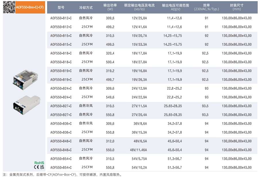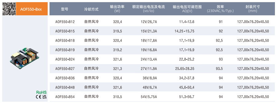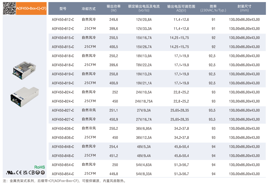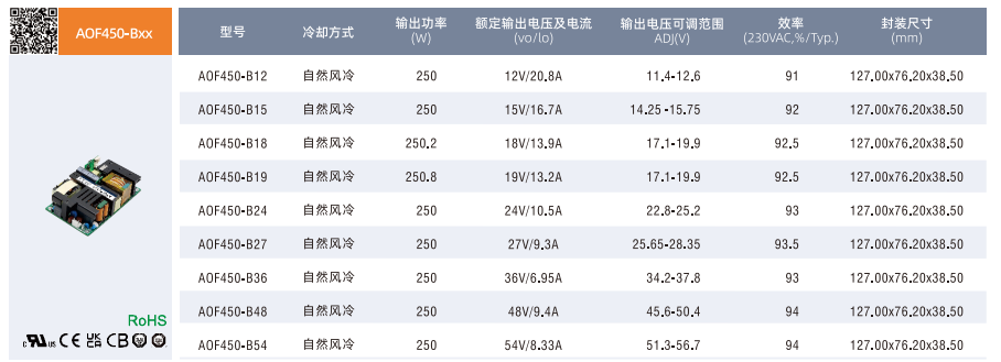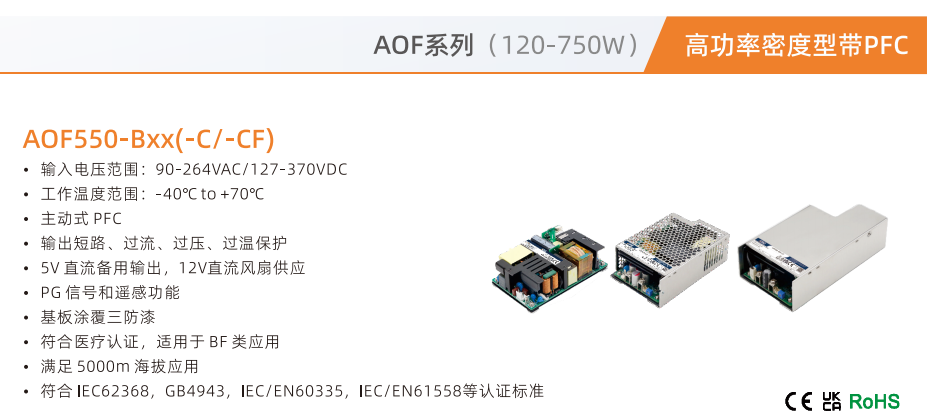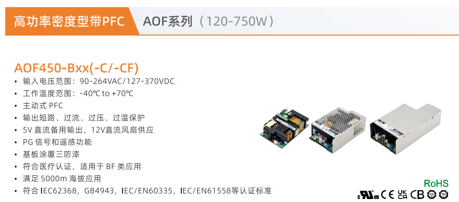 開關AOF450-Bxx(-C/-CF)系列 ?輸入電壓范圍:90-264VAC/127-370VDC ?工作溫度范圍:-40°Cto +70°C ?主動式 PFC ?輸出短路、過流、過壓、過溫保護 ?5V直流備用輸出,12V直流風扇供應中 ?PG信號和遙感功能 ?基板涂覆三防漆 ?符合醫療認證,適用于 BF類應用 ?滿足 5000m 海拔應用 ?符合IEC62368,GB4943,IEC/EN60335,IEC/EN61558等認證標準
