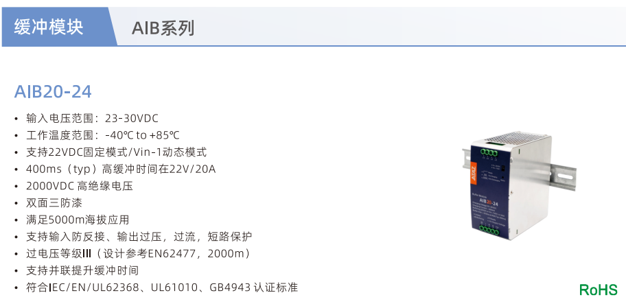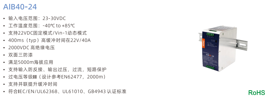 緩沖模塊電源AIB20-24 ?輸入電壓范圍:23-30VDC ?工作溫度范圍:-40°Cto +85°C ?支持22VDC固定模式/Vin-1動態(tài)模式 ?400ms(typ)高緩沖時間在22V/20A ?2000VDC高絕緣電壓 ?雙面三防漆 ?滿足5000m海拔應(yīng)用事 ?支持輸入防反接、輸出過壓,過流,短路保護魯 ?過電壓等級川(設(shè)計參考EN62477,2000m) ?支持并聯(lián)提升緩沖時間 ?符合IEC/EN/UL62368、UL61010、GB4943認證標準