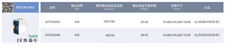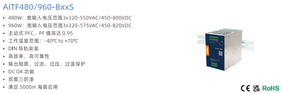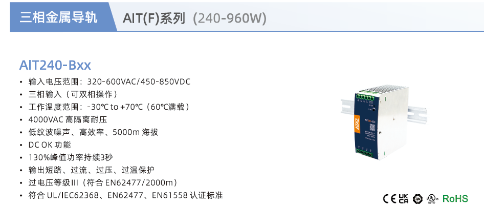 三相金屬導軌電源AIT240-Bxx ??輸入電壓范圍:320-600VAC/450-850VDC ??三相輸入(可雙相操作) ??工作溫度范圍:-30℃℃to +70℃(60℃滿載) ??4000VAC高隔離耐壓 ??低紋波噪聲、高效率、5000m 海拔 ·DCOK功能 ??130%峰值功率持續3秒 ??輸出短路、過流、過壓、過溫保護 ??過電壓等級川(符合 EN62477/2000m) ??符合 UL/IEC62368、EN62477、EN61558認證標準