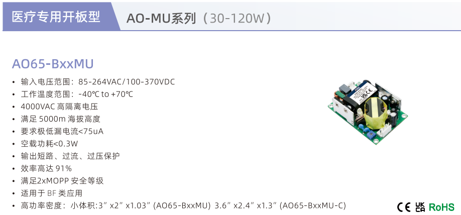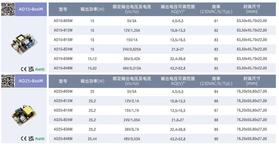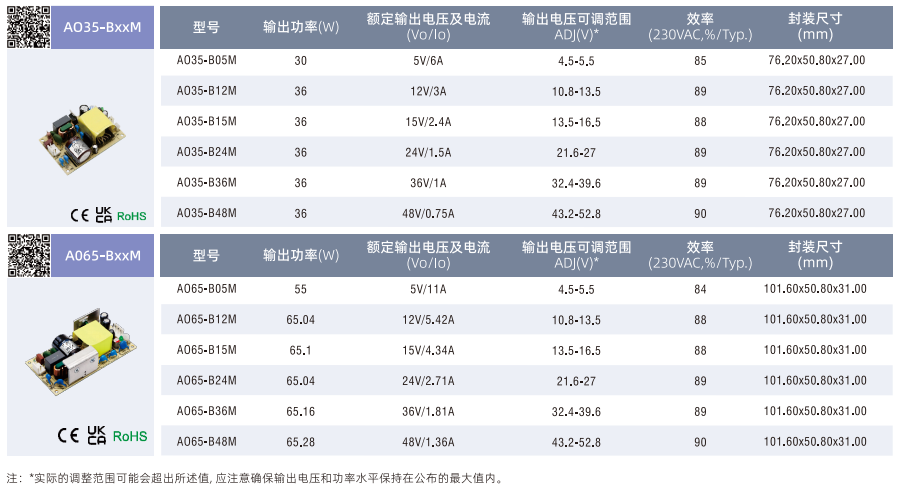 板載電源開板型AO-M系列 ??A015/25/35/65-BxxM ??輸入電壓范圍:85-264VAC/100-370VDC ??輸入可承受 305VAC/5S ??交直流兩用(同一端子輸入電壓) ??工作溫度范圍:-40°Cto+85℃(-30°C可滿載) ??4000VAC高隔離電壓 ??輸出電壓可調 ??輸出短路、過流、過壓保護 ??浪涌抗擾度滿足4級 ??安裝于 Classl(有 PE)系統 ??設計參考 UL/IEC62368、EN60335 認證標準