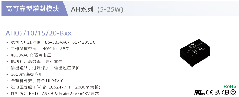 電源模塊AH05/10/15/20-BxX ??寬輸入電壓范圍:85-305VAC/100-430VDC ??工作溫度范圍:-40℃℃to+85℃℃ ??4000VAC高隔離電壓 ??低功耗、高效率、高可靠性 ??輸出短路、過流保護、輸出過壓保護 ??5000m 海拔應用 ??全塑料外殼、符合 UL94V-0 ??過電壓等級I(符合IEC62477-1,2000m 海拔) ??裸機滿足EMICLASSB及浪涌+2KV/±4KV要求