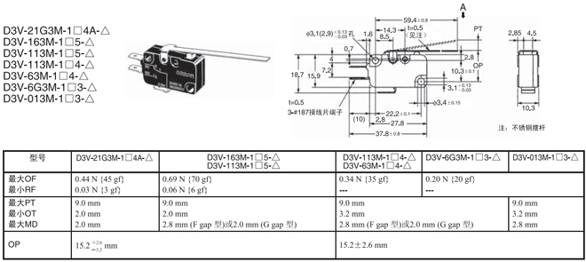 短擺桿型 內部安裝 1.96N {200gf} D3V-161-1□5-△ D3V-161-2□5-△ D3V-161-3□5-△