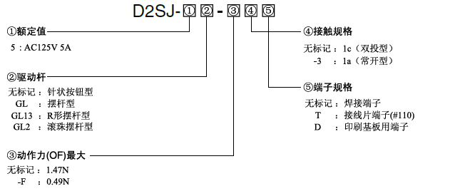 D2SJ-5 超小型基本開關(guān) 高安全而又可靠的超小型基本開關(guān) 外形尺寸與SS系列相同。 適應(yīng)未來市場需求。 備有5A型產(chǎn)品。