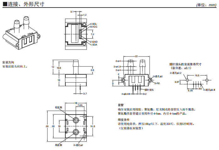 測量范圍:0~250Pa 小型、高精度、耐環境性能卓越的差壓傳感器 ±3%RD的高精度。 具備直線補償、溫度補償功能。 數字輸出(I2C通信)。 高流量阻抗減少旁路配置的影響。